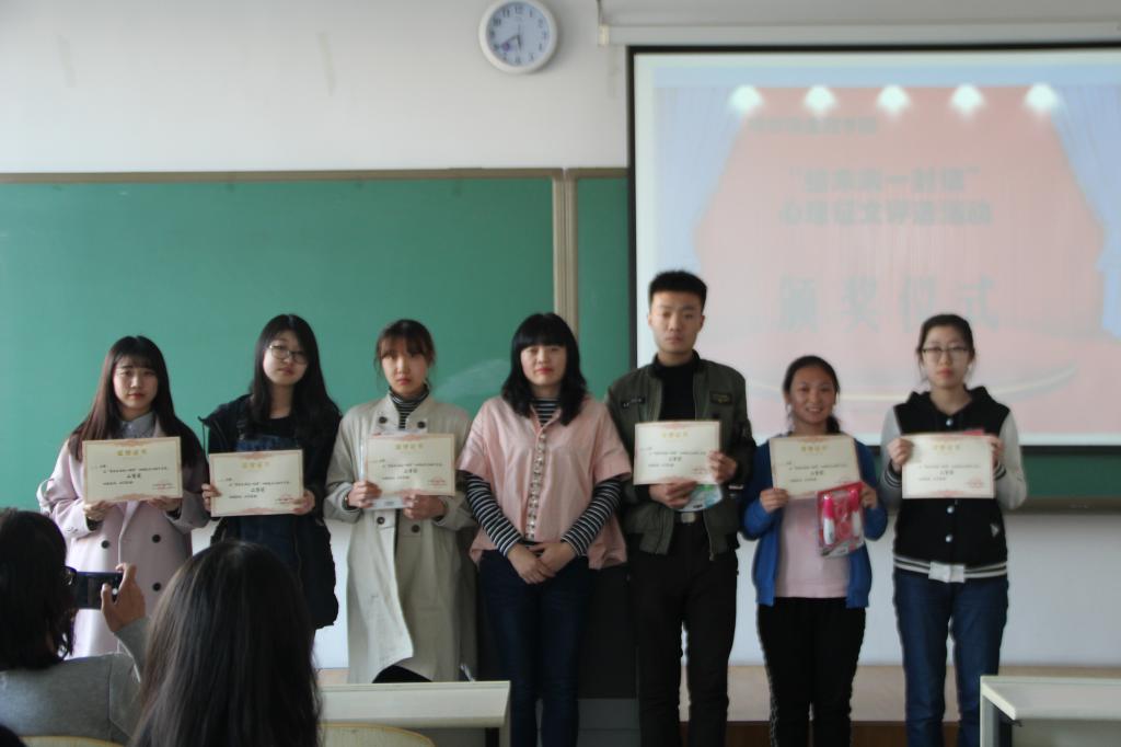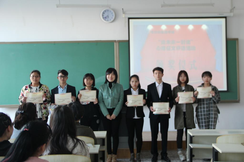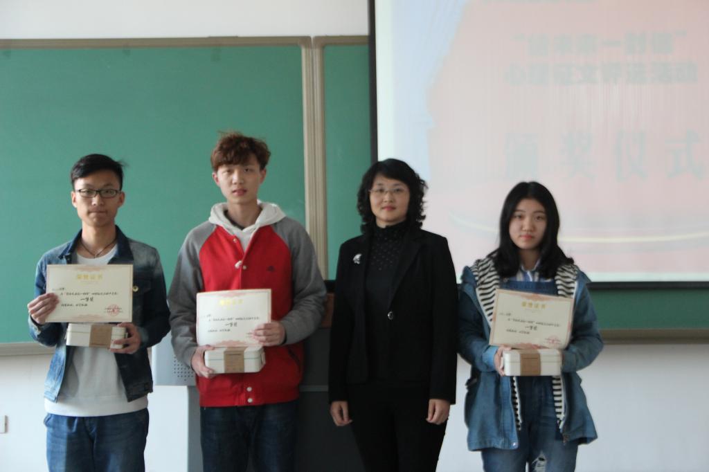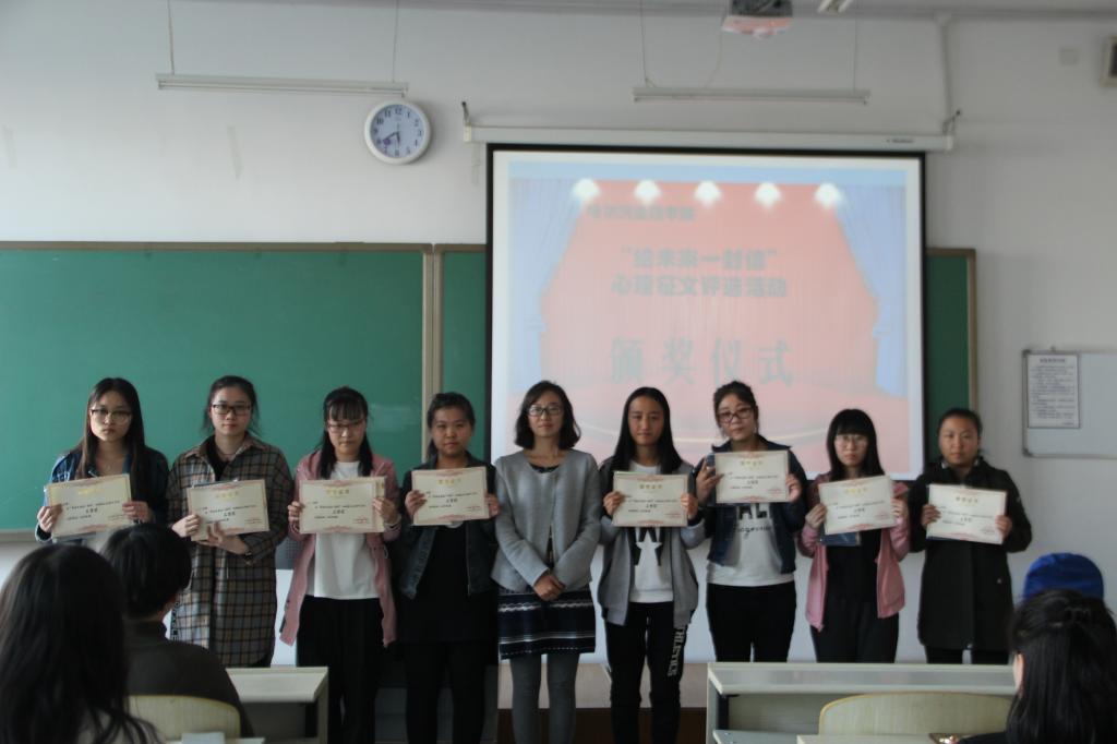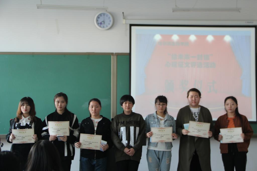 我院学生处于2017年于4月27日在新教105举行了“给未来自己的一封信”心理征文活动颁奖仪式。经过评委们近一个月的初选、复审,共评出一等奖5名,二等奖15名,三等奖20名,优秀奖35名。心理健康教育中心6位老师参加了颁奖,仪式由张慧敏老师主持。