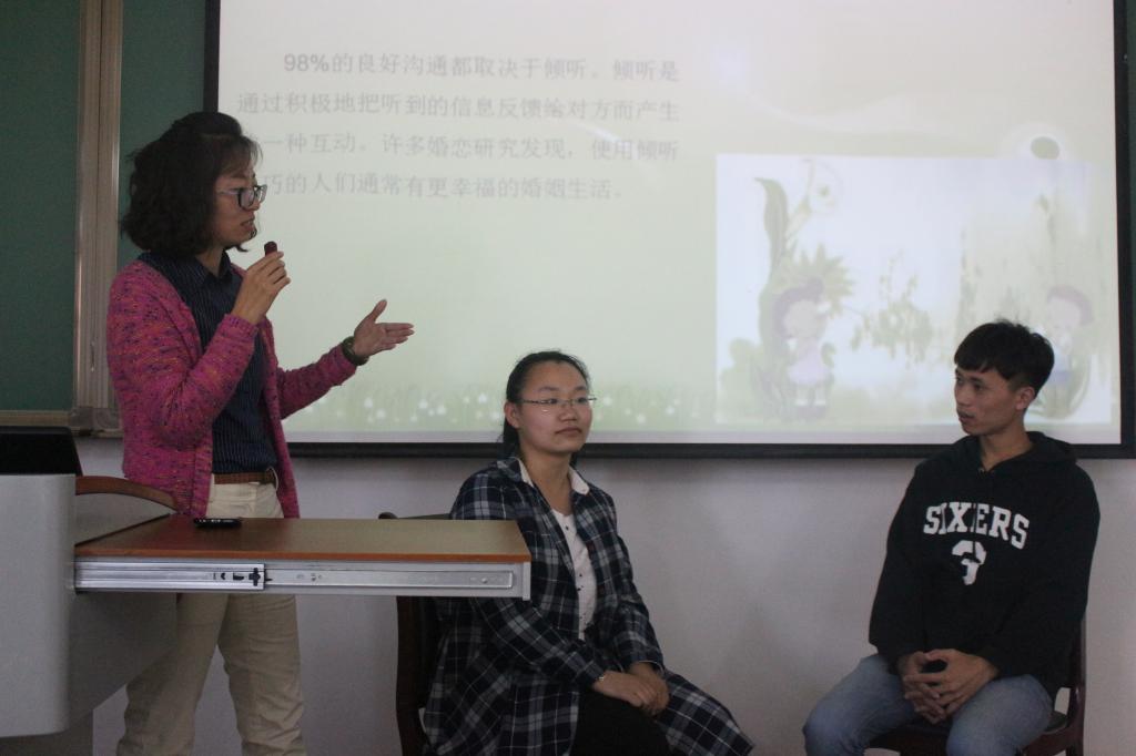 接下来老师介绍了恋人之间沟通的四种错误模式,以及这些错误模式背后隐藏的内心缺失和人格特点。然后从心理学角度分析了恋人争吵和冲突的起因,用生动的例子讲解了恋人间、朋友间沟通的原则和方法,并邀请同学到前面做互动演示,同学们热情高涨,积极参与到讨论中。最后老师带领大家做“感知幸福小练习”,教会大家提高感知幸福、表达幸福、获取幸福的能力。