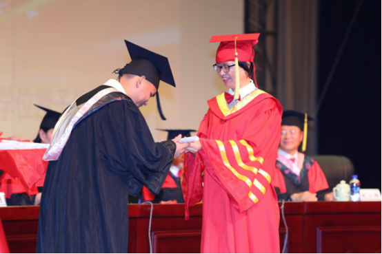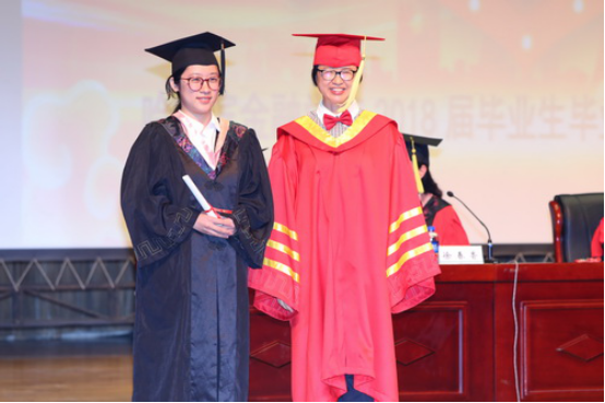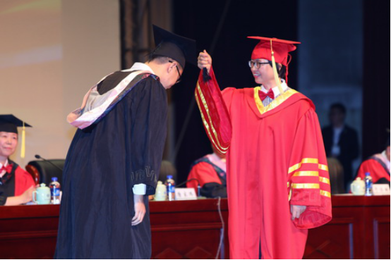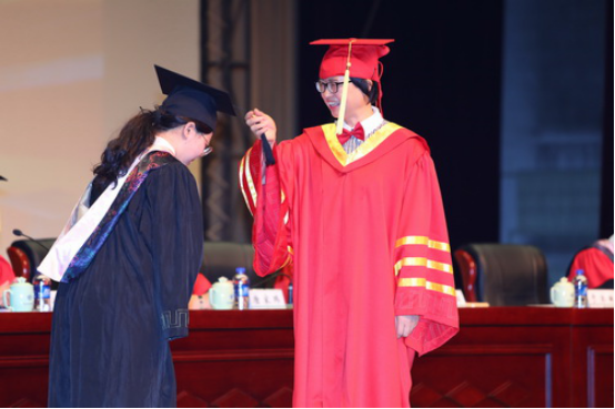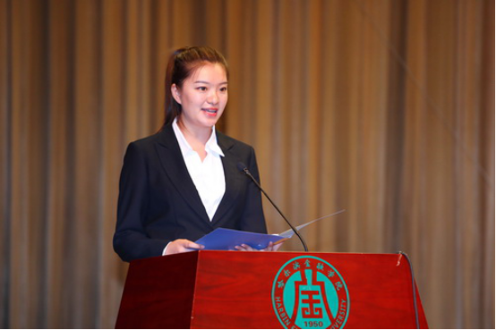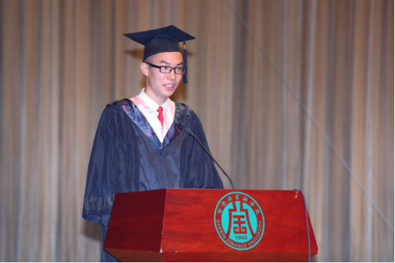 毕业生代表,金融系于梦男同学回忆了大学四年生活,他代表全体毕业生感谢学校对每一位学子四年来的辛勤培育,他承诺:将做拥有智慧并富有激情的人,做胸怀大志并脚踏实地的人,做德才兼备并勇于创新的人,做负有责任并敢担重任的人!