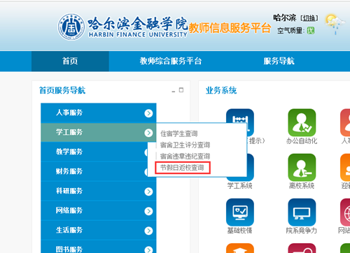 各位系书记可登录哈尔滨金融学院统一身份认证平台查看本系学生返校情况。(操作步骤:登录哈尔滨金融学院统一身份认证平台-学工服务-节假日返校查询)